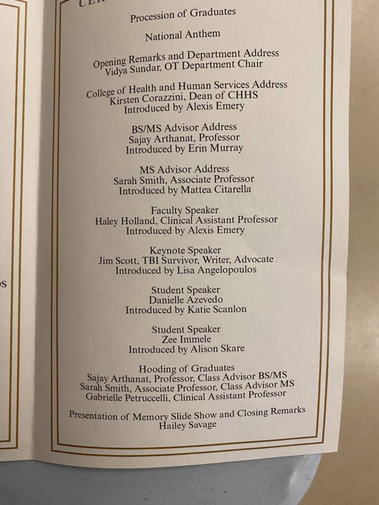 Hopefully I’ve been clear on how grateful I am for all the opportunities that I get to share my experience through various speaking engagements. Whether it’s a large audience or a one on one interaction, each conversation is truly a blessing in my life! I’ve been blessed to speak with groups at schools ranging from elementary to graduate students, hopefully leaving each audience with some information that they find valuable in their journeys. After sharing in so many different venues to a wide range of audiences, I thought I’d pretty much covered the speaking bases. That was until a couple of months ago when I was asked to speak at the hooding ceremony (graduation) celebrating the 2025 Masters of Science in Occupation Therapy from the University of New Hampshire!